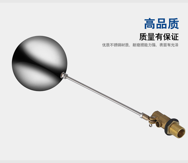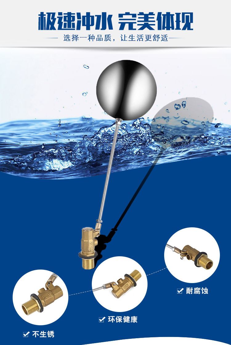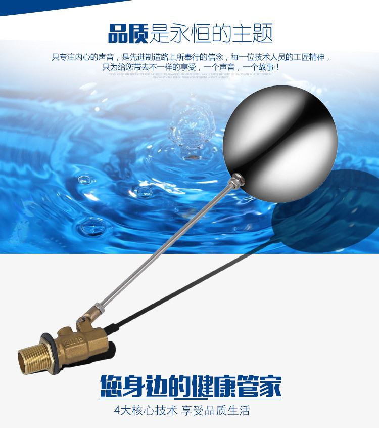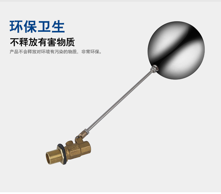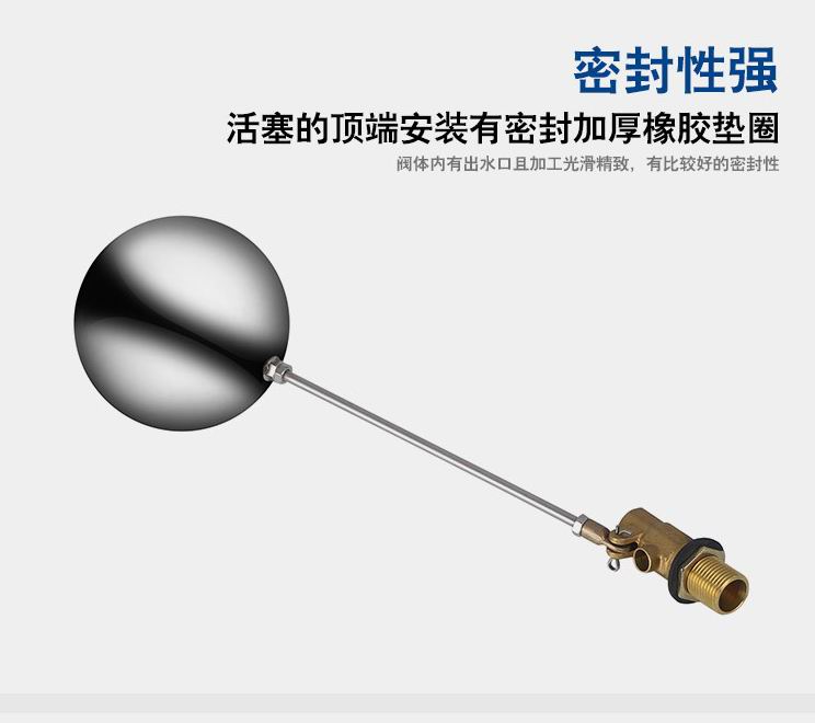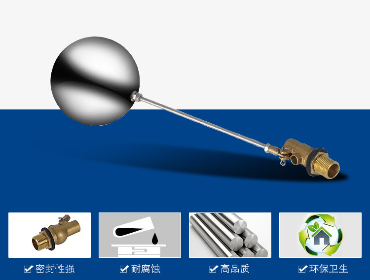 當水塔內水面下降時,浮球下落,利用水管內水的壓力,將閥體里的密封硅膠柱塞打開,閥體開啟供水,當水塔水位上升時,浮球上浮,連桿帶動柱塞,硅膠體密封進水孔,閥體停止供水.