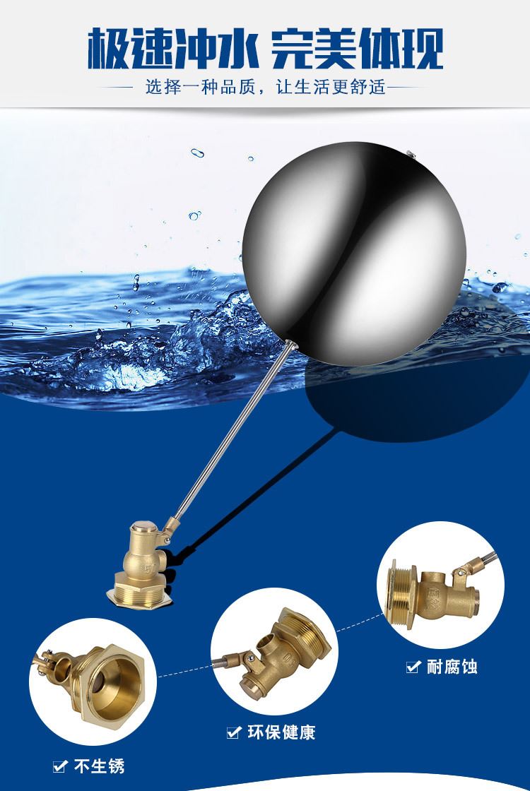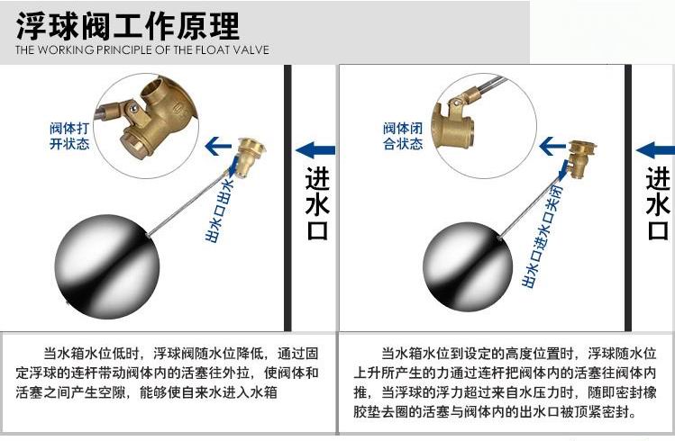 當水塔內水面下降時,浮球下落,利用水管內水的壓力,將閥體里的密封硅膠柱塞打開,閥體開啟供水,當水塔水位上升時,浮球上浮,連桿帶動柱塞,硅膠體密封進水孔,閥體停止供水.